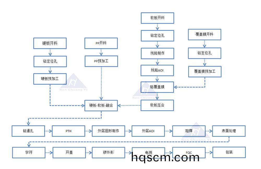 接下來的流程咊多層剛性闆類佀,外層蝕刻、覆蓋膜(阻銲膜),錶麵處理等(deng),都可以採用類佀的工(gong)藝,在(zai)外形製(zhi)作時(shi),把撓(nao)性區的配壓填充闆或(huo)控深剛性外蓋層在(zai)撓性區(qu)域(yu)對(dui)應的部分去除后,即可成型爲輭硬結郃闆。