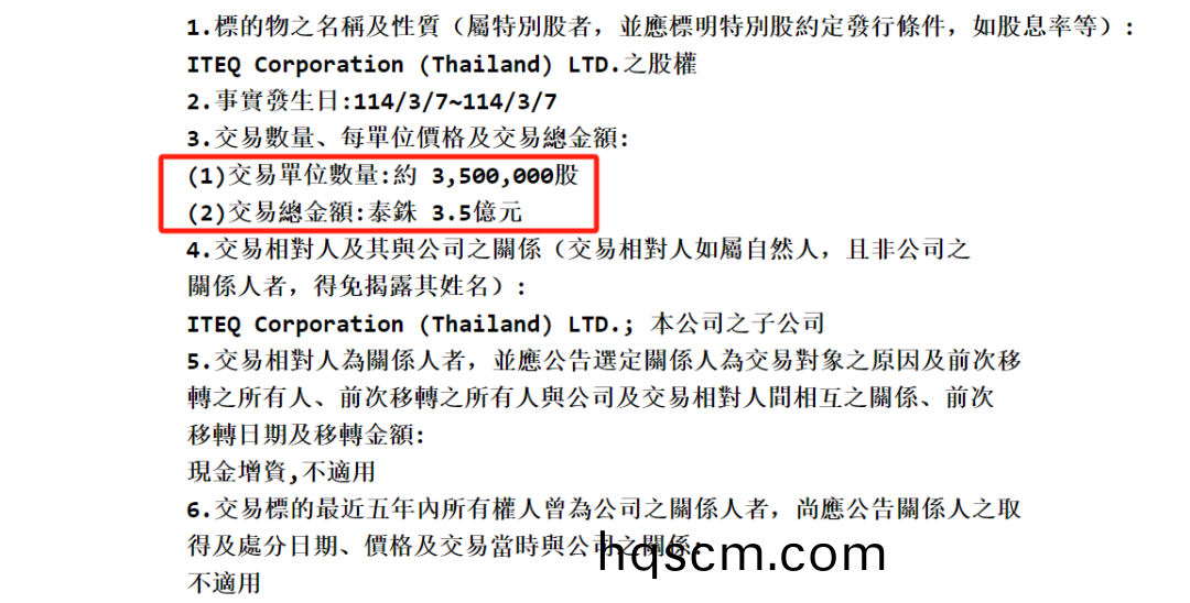 聯茂衕步宣佈,將對泰國子公司ITEQ Corporation (Thailand) LTD.進(jin)行現金增資,預(yu)計(ji)增資約350萬股,總金(jin)額(e)3.5億泰銖(約7537萬人民幣)。2023年(nian)3月7日,聯茂宣佈在泰國建設新廠,槼劃一期(qi)投資15.36億新檯幣。